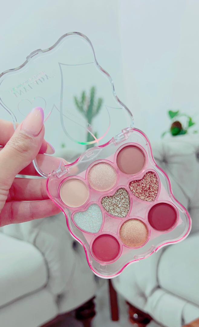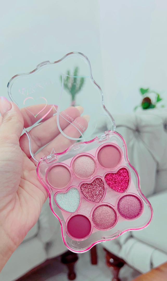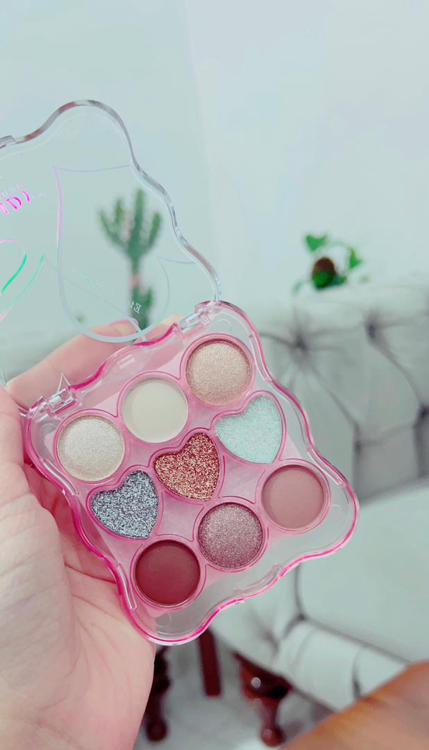 سایه انی لیدی طرح قلب🩷 شامل ۹رنگ سایه گلیتری و مات که رنگبندی نود دارن پیگمنت بسیااااار عالی ای دارن خیلی خوب فیکس میشه و نمیریزه اصلا
